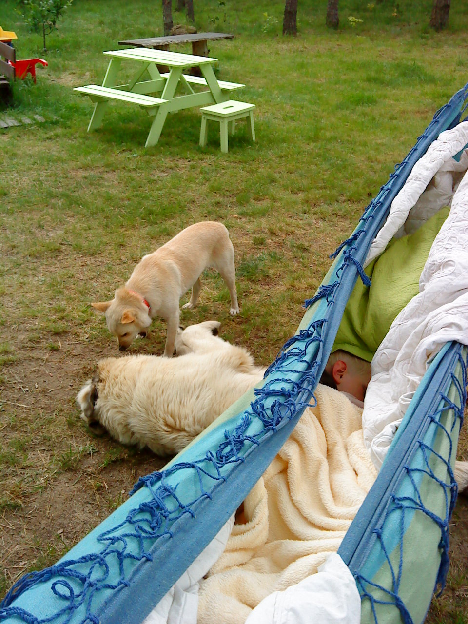 Ale nie tylko poranki mamy piękne.. Niedzielne popołudnia bywają uroczo ospałe:) Świergot ptasi, szum drzew…bujanie hamaka, rodzina razem…ot, małe wielkie szczęścia. Leoś swoje letnie popołudniowe drzemki odbywa właśnie w bujaku:) Opatulony w kołderki i kocyki śpi słodko …tata Leosia także:) A pilnuje ich Hrabia. Oczywiście hamakujemy się na boso:)