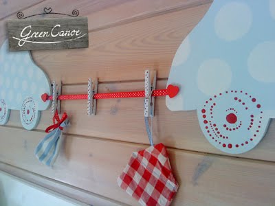 Nad półkami książeczkowymi powiesiłam zrobioną przez siebie od początku do końca „mini galeryjkę” :) z motywem autek. Autka pomalowane są w błękitne i białe groszki i grochy, spinacze robiące za haczyki do zdjęć czy co tam będzie nam się akurat chciało wieszac, równiez przyozdobiłam kropeczkami. Auta wycięte zostały z płyty mdf, pomalowane farbą akrylową. Na razie spinacze trzymają torebeczki z olejkiem eukaliptusowym, ale o tym za chwilę.