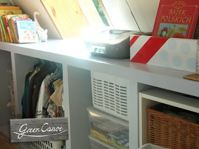 Pokoik Leo jest mały. Ma niespełna 7 metrów. I do tego jeszcze dysponuje SKOSAMI :) kolokwialnie rzecz ujmując. Planując rozmieszczenie w nim mebli mieliśmy niezły dylemat – jak to zrobić, by nie zagracić, a jednocześnie pomieścić wszystkie „skarby” synka, no i jeszcze jego ubranka. Wykorzystaliśmy maksymalnie wszelkie zakamarki zostawiając na środku wolną przestrzeń – by mały miał gdzie się bawić. Skosy zabudowaliśmy rządem wnęk głębokich że HO HO :) – i tam jest Leosiowa garderoba. Zabudowaliśmy również skosy po drugiej stronie – tym razem półkami na zabawki, klocki i tym podobne bardzo ważne gadżety:) Dzięki owym zabudowom – zyskaliśmy dużo miejsca dla niczym nieskrepowanych wariacji:)