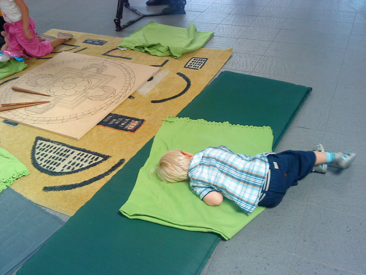 Obserwowałam dłonie płynnie rysujące mandalowe wzory, patrzyłam na twarze pełne skupienia, ale również jakiejś wewnętrznej radości…Patrzyłam wreszcie na naszego synka chłonącego tych dziwnych panów, rysujących dziwne wzory. Leo ze szczerością dziecka położył się na ich karimacie i uczestniczył we wszystkim na leżąco – wolny od skrępowania czy nieśmiałości. Widziałam wyraźnie, że zerkający na niego mnisi uśmiechali się ciepło pod nosem.