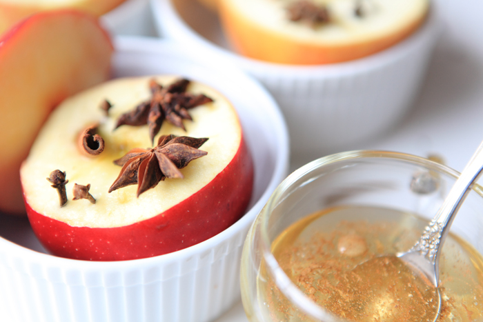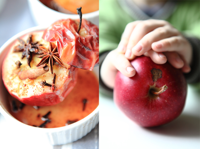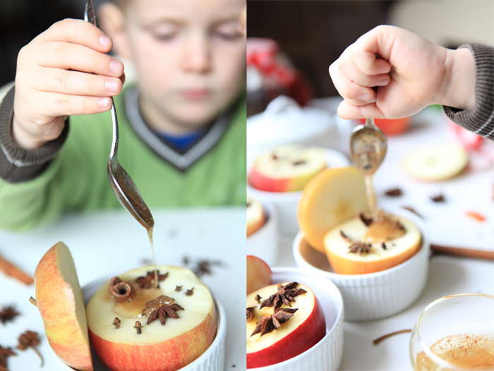 Do naczynka, w którym miodzio zimuje wrzucam jeszcze anyżek. Wiem, że wiele osób nie lubi jego zapachu – a ja owszem. Taki miód jest idealny do wieczornych herbatek, do pieczonych jabłek, deserów…no miodzio po prostu:) Pieczone jabłka polewam nim dopiero po upieczeniu ( tak, by nie tracił swych zdrowotnych właściwości) Dziś jednak Leo się uparł i zamiodował nasze jabłka już na samym początku. Do kokilek, w których je pieczemy dolewam dosłownie kapkę wody, wrzucam na dno goździki i anyż. Jabłka przecinam tak, by powstał kapelusik:) i szpikuję je również goździkami, posypuję startym cynamonem, kardamonem. Żadna filozofia, a rozkosz dla podniebienia niebywała.