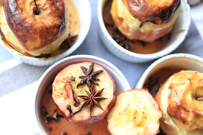 Uwielbiam jabłka pieczone! Ja przekrawam je na pół i daję do środka orzechy, rodzynki, żurawinę i łyżeczkę powideł, posypuję cynamonem i imbirem,a na koniec polewam miodem i zamiast ogonka wtykam gwoździka :) i do piekarnika!