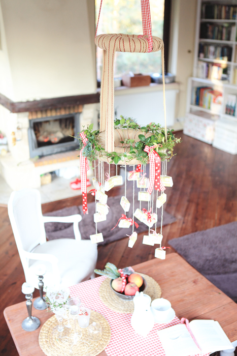 Kalendarz jest duży – ma około 1,50 m wysokości; dolny wieniec jest szeroki na 40 cm, górny na 25. Robi imponujące wrażenie. Powiesiłam go dziś tylko w celu zrobienia zdjęć – jutro będzie zdjęty. Ale te kilka godzin wystarczyło by wprowadził do domu świąteczny klimat:) W grudniu dostanie więcej dekoracji zielonych – wijących się gałązek barwinka, bluszczu i oczywiście świerka. A oto dzisiejsze migawki z naszego kalendarza: