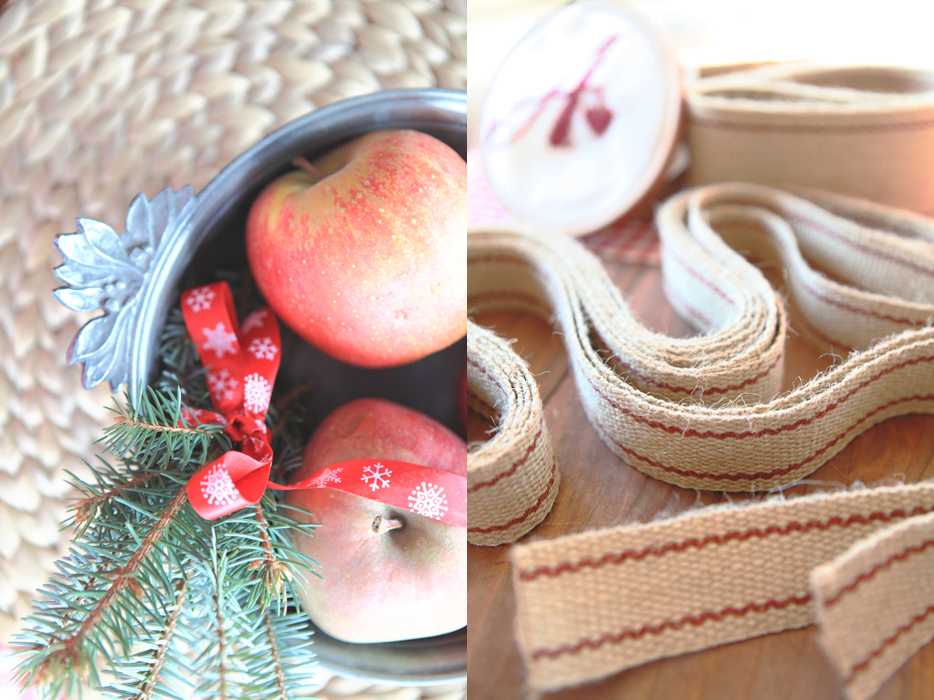 Większość materiałów składowych pochodzi z Leroy Merlin. Jakiś czas temu zauważyłam tam świetne jutowe szarfy – z czerwonymi paseczkami po bokach. IDEALNE:) Do tylu rzeczy idealne, że oczywiście nabyłam niebotyczne ilości metrów. Na bank wykorzystam je do świątecznych wianków i ozdób. Pysznią się już na świątecznym kalendarzu. Nasz wiankowy adwentowy wisiołek to zestaw dwóch obręczy słomianych, otulonych wyżej wspomnianą jutową taśmą i połączonych potrójnymi wstęgami. Na większym, dolnym wianku powiesiłam kolejno dni grudnia, oczywiście naniesione na pudełka. Zaprojektowałam je sobie w formie nalepek odpowiadających wymiarom pudełek. Po wydrukowaniu szybko można przykleić je na opakowanie. Jeśli ktoś nie ma specjalnego papieru nalepkowego, to można wydrukować na zwykłej kartce, pociąć i po prostu przykleić klejem. W każdym bądź razie kochani – mam jeszcze jeden zestaw takich gotowych pudełeczek:) poubieranych już w zimowe grudniowe numerki. Jeśli ktoś z Was miałby ochotę je przygarnąć, to niech da znać w komentarzu. W przyszłym tygodniu wylosuję pudełeczkowego nabywcę, a do paczuszki dołączę zieloności z naszego ogrodu – do dekoracji, które widać na zdjęciach. A żeby każdy z Was miał możliwość nałożenia cyferek na swoje pudełka ( zakładam, że niektórzy mogą nie znać programów graficznych, by sobie je zrobić samodzielnie) TUTAJ umieściłam plik z pdf’em. To są właśnie owe cyferki – możecie je sobie teraz wydrukować także na swój użytek. No, a teraz spójrzmy na wszelkie przydasie, które wykorzystałam przy pracach kalendarzowo wisiołkowych.